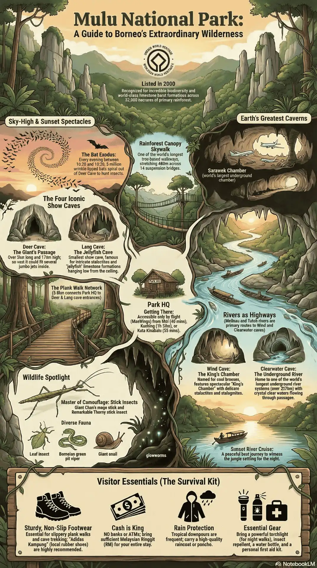 Deep within the heart of Sarawak, Borneo, lies Gunung Mulu National Park, a UNESCO World Heritage site renowned for its dramatic limestone pinnacles and some of the largest cave systems on the planet. Spanning over 528 square kilometres, this pristine rainforest is a sanctuary for rare life, where adventure is the only way of life. Accessible primarily by “wings, water, or walking,” Mulu offers a rare chance to disconnect from the modern world and immerse yourself in nature.
